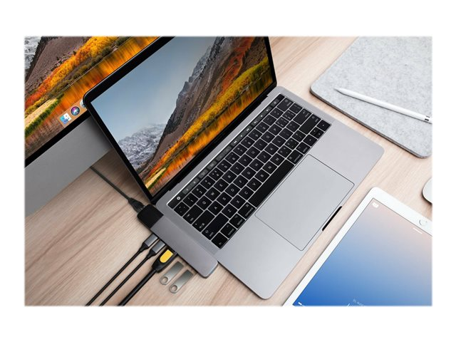 Hub USB-C de forme adaptée pour MacBook Pro et MacBook Air. Ce puissant adaptateur USB-C ajoute 6 ports : adaptateur ethernet gigabit, HDMI 4K, alimentation USB-C de 100 W, et plus encore.