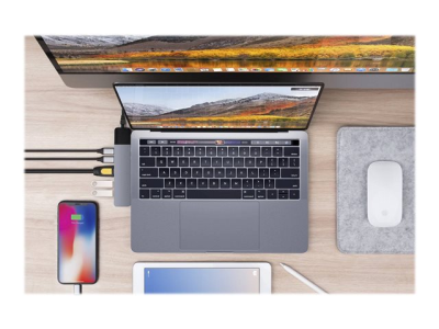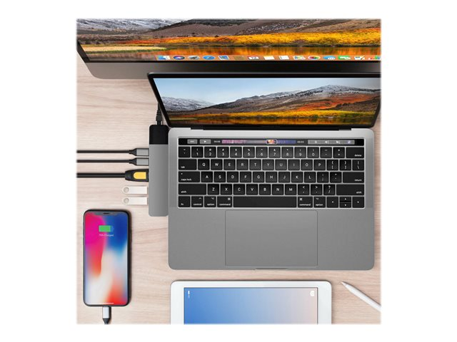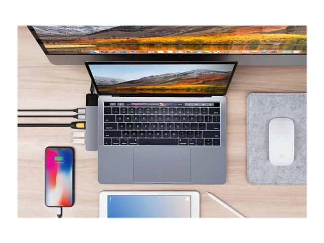 Hub USB-C de forme adaptée pour MacBook Pro et MacBook Air. Ce puissant adaptateur USB-C ajoute 6 ports : adaptateur ethernet gigabit, HDMI 4K, alimentation USB-C de 100 W, et plus encore.