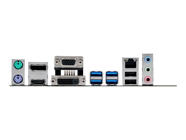 | Interfaces | 1 x clavier PS/2 1 x LAN (Gigabit Ethernet) 4 x USB 3.0 1 x souris PS/2 1 x sortie de ligne audio - mini-jack 1 x entrée de ligne audio - mini-jack 1 x microphone - mini-jack 2 x USB 2.0 1 x VGA 1 x DVI-D 1 x DisplayPort 1 x HDMI |