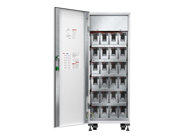 Armoire à batterie modulaire pour une durée de fonctionnement étendue pour les onduleurs avec batteries internes. L'armoire est livrée sans batteries, celles-ci doivent donc être achetées séparément. Il est possible d'installer jusqu'à six branches de batteries (E3SBT4 ou E3SBTH4) dans l'armoire.