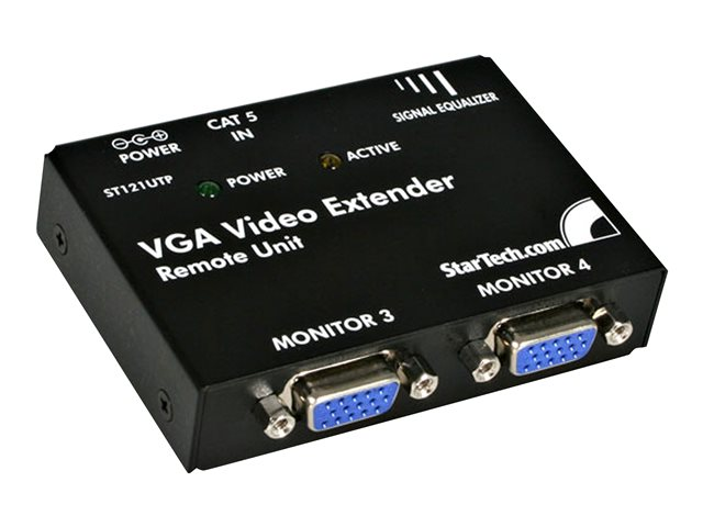 L'extendeur vidéo VGA sur Cat 5, référence ST121UTPEU, vous permet d'étendre votre signal vidéo VGA à au plus 150 mètres et de connecteur jusqu'à 4 écrans (2 localement et 2 à distance), à partir de cette source unique. Le ST121UTPEU est un kit complet incluant une unité locale de transmission et une unité réceptrice, offrant ainsi une solution complète dans les cas où des écrans distants sont requis. L'unité locale inclut une entrée VGA unique et deux sorties VGA, vous permettant de voir et de répartir votre signal VGA source entre deux écrans indépendants, de manière locale. Le signal vidéo VGA est ensuite envoyé via un câble UTP 4 paires de catégorie 5 ou supérieure, à une unité distante qui est également dotée de deux sorties VGA supplémentaires, vous offrant ainsi la liberté d'afficher votre source VGA sur au plus quatre moniteurs. Bénéficie de la garantie StarTech.com de 2-ans et de l'assistance technique gratuite à vie.