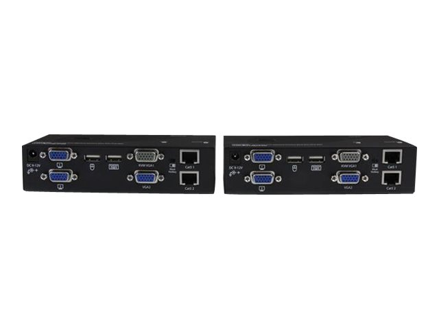 L'extendeur KVM double VGA sur Cat5 prend en charge les boutons poussoirs et les raccourcis clavier d'utilisation facile, qui vous permettent de permuter entre les systèmes connectés localement et à distance, alors que les branchements de console aux deux extrémités de votre configuration offrent un accès facile à tous les systèmes connectés aux deux endroits. Les raccourcis clavier permettent également de régler la vidéo pour optimiser la qualité de l'image sur diverses distances. L'extension sur deux câbles standard Cat5 (ou plus) vous permet d'utiliser le câblage existant afin d'assurer l'accès à distance à votre serveur ou à votre commutateur KVM.